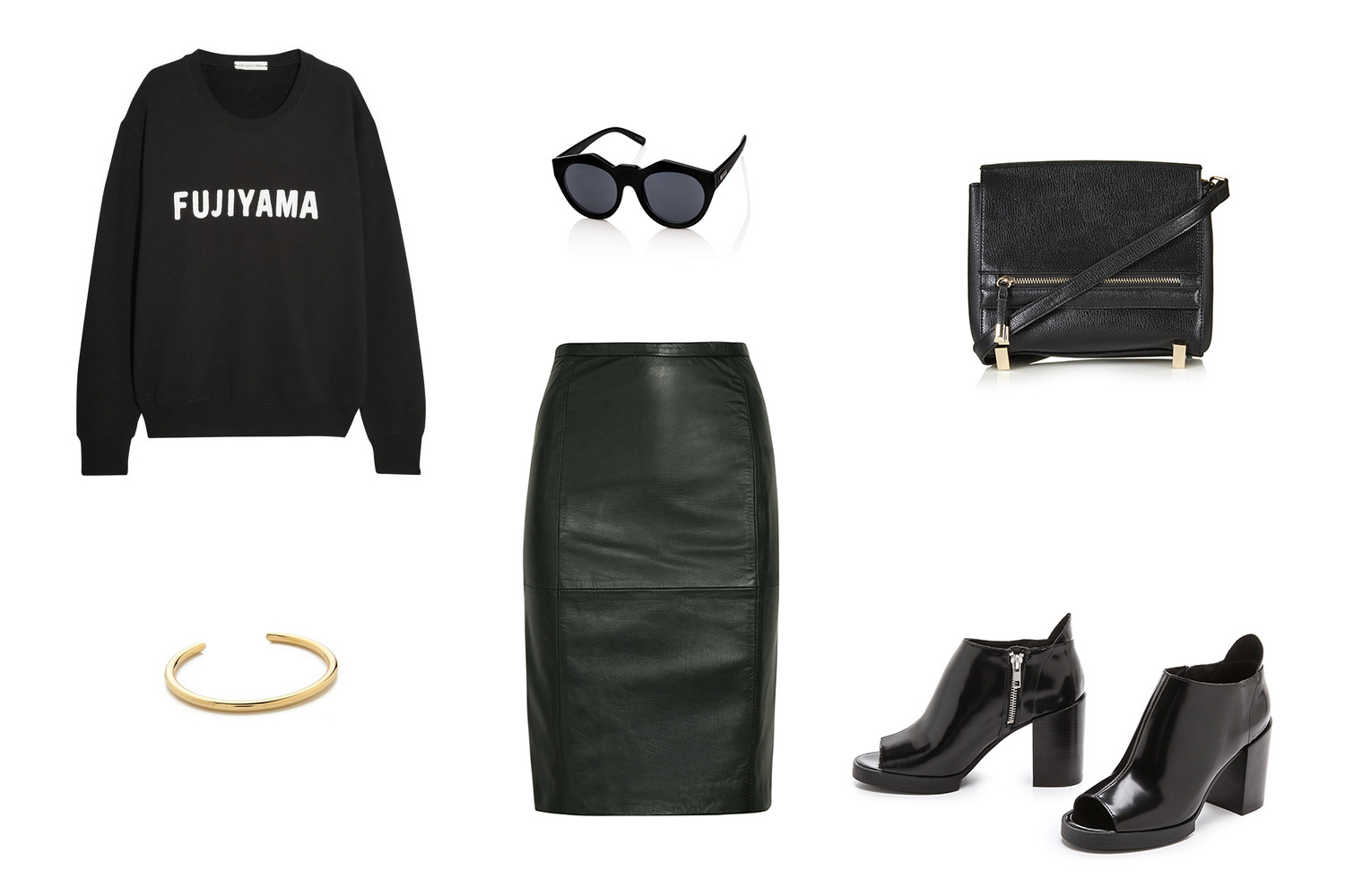 Sweatshirts are the cloth I really want to cuddle in right now. Give me of the Etoile Isabel Marant collection, and everything falls into place. Add a little extra like a fireplace, chunky boots and this cute, perfect fitted skirt from Finders Keepers and, well, job done. Sweatshirt paired with leather pencil skirts are such a great cool combination.